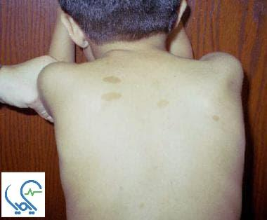 • وجود لکه‌های قهوه‌ای روشن روی پوست (Café-au-lait spots) که معمولاً در بدو تولد یا ماه‌های اول زندگی دیده می‌شوند.